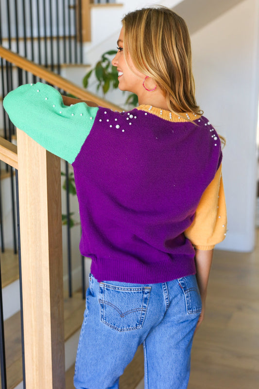 "Queen of Mardi" Pearl & Tinsel Color Block Knit Top