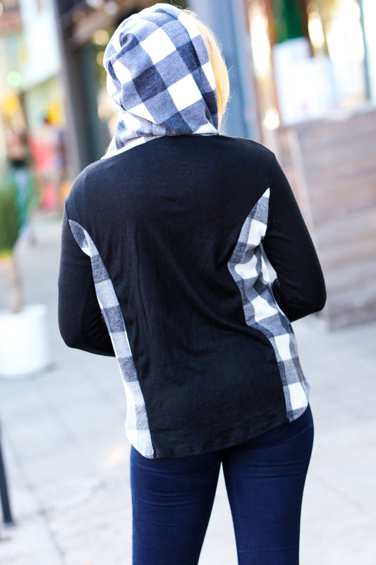 Adorable In Black & Ivory Plaid Hacci Knit Hoodie