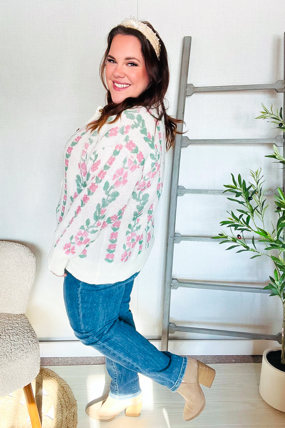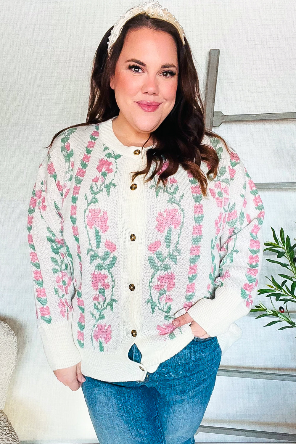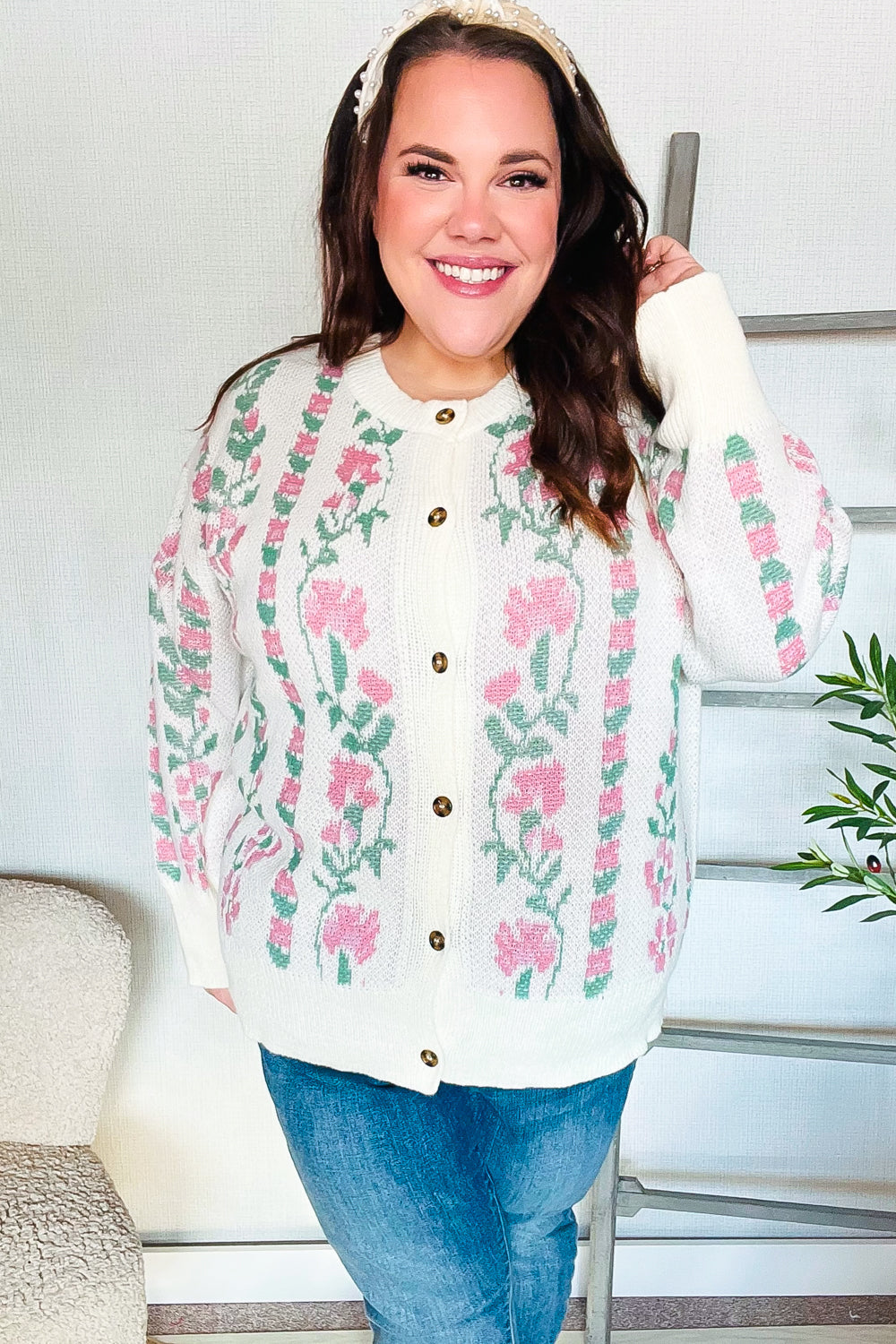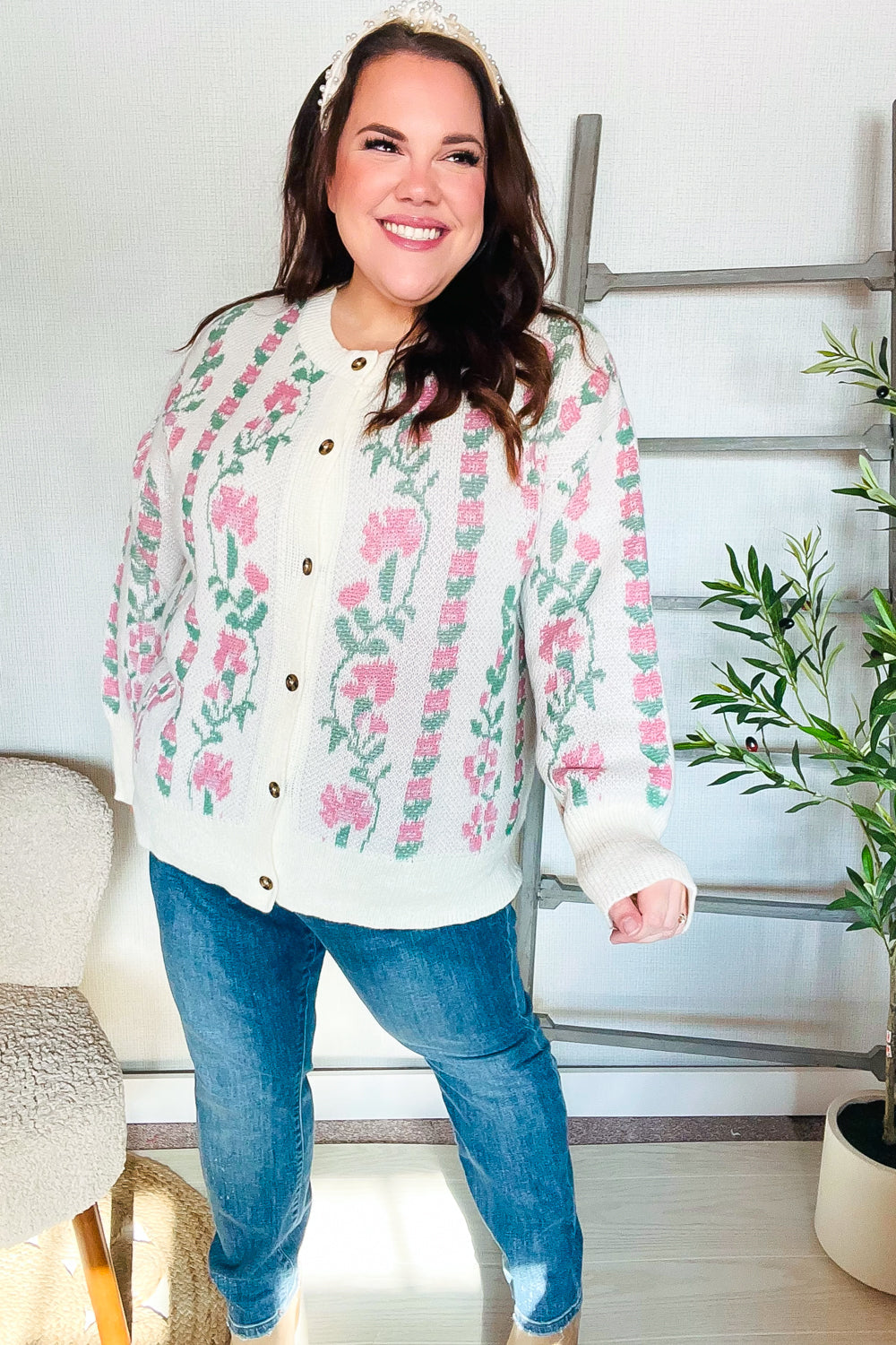All For Love Ivory Jacquard Vertical Floral Button Down Cardigan